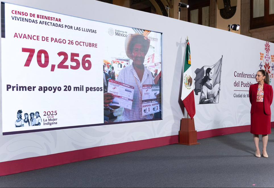 Ciudad de México, 27 de octubre de 2025.- El Gobierno de México, a través de la Secretaría de Bienestar, informó que, al 26 de octubre, 70 mil 256 personas han recibido el primer apoyo de 20 mil pesos, así como dos vales de despensa y uno de enseres, por las afectaciones a causa de las lluvias extraordinarias registradas a comienzos de octubre en Veracruz, Hidalgo, Puebla, San Luis Potosí y Querétaro.