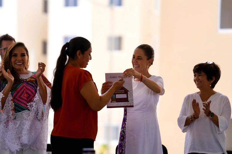 Playa del Carmen, Quintana Roo, a 29 de noviembre de 2025.- En Playa del Carmen, Quintana Roo, la Presidenta Claudia Sheinbaum Pardo encabezó la entrega de 225 viviendas nuevas del Instituto del Fondo Nacional de la Vivienda para los Trabajadores (Infonavit), como parte del programa Vivienda para el Bienestar, además de 497 liberaciones de hipoteca del Fondo de Vivienda del Instituto de Seguridad y Servicios Sociales (Fovissste) y 193 escrituras del Instituto Nacional del Suelo Sustentable (INSUS).