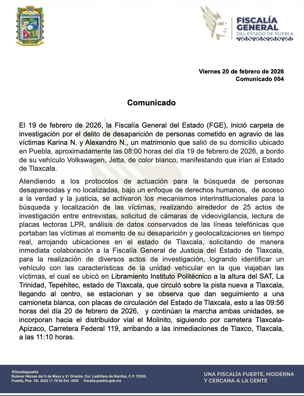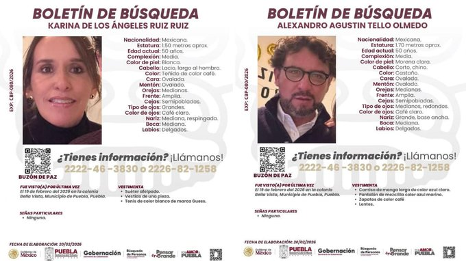 Horas después, familiares denunciaron que la pareja no respondió llamadas ni mensajes. La Fiscalía General del Estado de Puebla (FGE) inició carpeta de investigación por el delito de desaparición de personas y activó el Protocolo Alba bajo un enfoque de derechos humanos y acceso a la verdad.