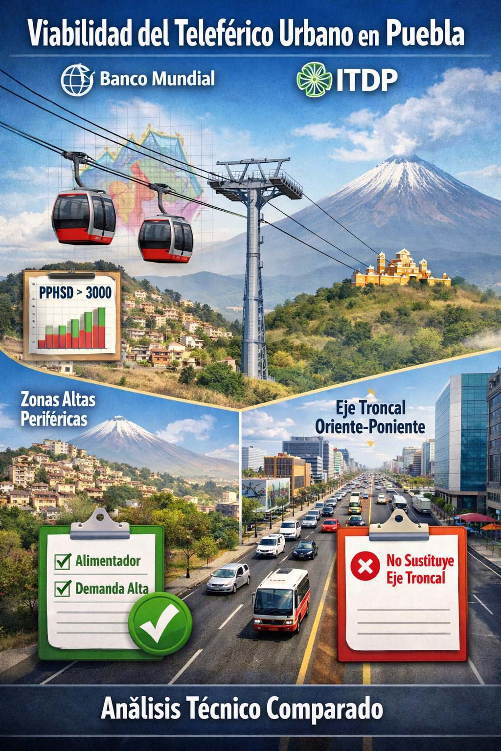 Un teleférico en Puebla sería viable si conecta zonas altas periféricas, funciona como alimentador, acredita demanda superior a 3,000 PPHSD y se integra tarifariamente.