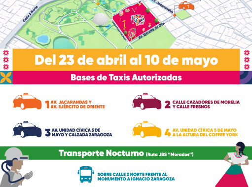 Como parte de este esquema, se instalarán cuatro bases de taxi, ubicadas en puntos estratégicos para asegurar el ascenso ordenado de pasajeros. Estas se localizarán en Avenida Jacaranda y Avenida Ejército de Oriente; calle Cazadores de Morelia y calle Fresnos; Avenida Unidad Cívica 5 de Mayo y Calzada Ignacio Zaragoza; así como en Avenida Unidad Cívica 5 de Mayo, a la altura del Coffe York.