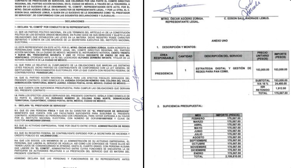 De acuerdo con la documentación difundida —y referida por la dirigencia morenista— Andrade recibe 12 pagos mensuales de 175 mil 577.50 pesos por la prestación del servicio denominado “Estrategia digital y gestión de redes sociales para PAN CDMX”, firmado entre el Comité Regional panista en la capital y Andrade como persona física.