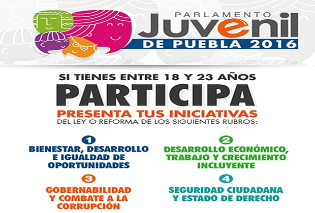 En el Parlamento Juvenil 2016 podrán participar mujeres y hombres que tengan entre 18 y 23 años de edad y que residan en el Estado de Puebla. Los interesados deberán mandar al correo electrónico Esta dirección de correo electrónico está siendo protegida contra los robots de spam. Necesita tener JavaScript habilitado para poder verlo. los siguientes documentos: