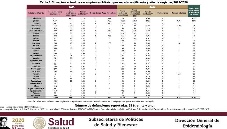 Jalisco encabeza la lista de entidades con más contagios, registrando 2,153 casos. Le siguen Chiapas, con 326 contagios, y Ciudad de México, con 228 casos confirmados. Desde el inicio del brote se han documentado 31 defunciones, un indicador que mantiene alerta a los sistemas de salud locales y nacionales.