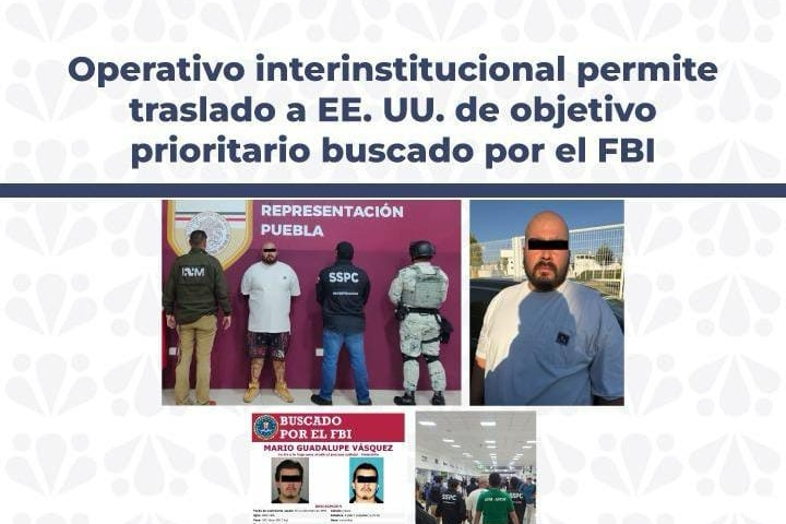 Un operativo interinstitucional permitió el traslado a Estados Unidos de Mario Guadalupe N., detenido en Puebla con estupefacientes y posteriormente identificado como un objetivo prioritario requerido por el FBI. La acción, ejecutada por la SSPC, el INM y la FGE Puebla, se consolidó luego de verificar que el detenido también usaba el nombre José Francisco N. y contaba con una solicitud vigente en territorio estadounidense.