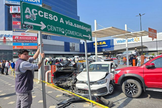 En el sitio, se observó una camioneta roja tipo pick up impactada contra dos autos, un vehículo deportivo gris destruyó una pluma de acceso, un auto negro quedó atravesado en un carril, y un Golf oscuro quedó totalmente destrozado. Las demás unidades estaban dispersas alrededor del lugar.