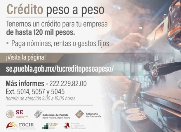 ¡Síguenos!Con el fin de facilitar la atención de usuarios del programa de reactivación económica crédito Peso a Peso con financiamientos de 25 mil a 120 mil pesos, la Secretaría de Economía puso a disposición del público la plataforma de internet “Tu crédito Peso a Peso” (http://se.puebla.gob.mx/tucreditopesoapeso)