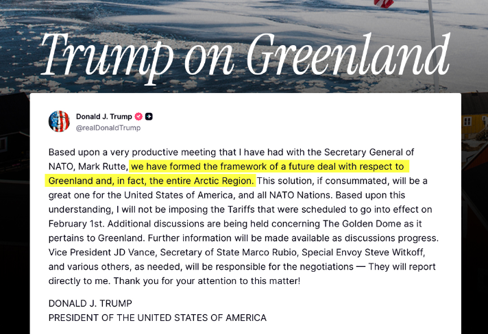 Como resultado directo de este avance, Trump anunció que no impondrá los aranceles que estaban programados para entrar en vigor el 1 de febrero, decisión vinculada al progreso registrado durante el encuentro con la dirigencia de la alianza atlántica.