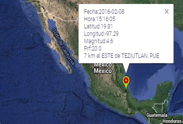 ¡Síguenos!El Centro de Monitoreo Sismológico Nacional informó que este lunes se registró un sismo de 4.6 grados, a las 15:16 horas, con epicentro ubicado a 7 kilómetros de lado este del municipio de Teziutlán, Puebla.