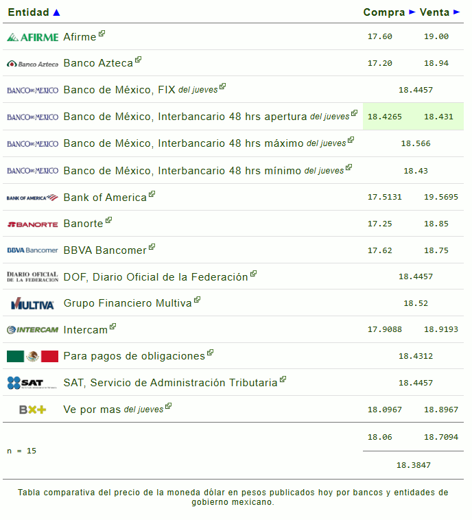 A continuación te brindamos el tipo de cambio dólar a peso hoy en México (USD-MXN), el precio compra y venta en los bancos mexicanos e instituciones de gobierno.