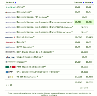A continuación te brindamos el tipo de cambio dólar a peso hoy en México (USD-MXN), el precio compra y venta en los bancos mexicanos e instituciones de gobierno.