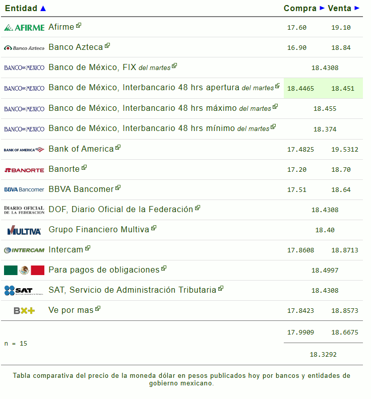 A continuación te brindamos el tipo de cambio dólar a peso hoy en México (USD-MXN), el precio compra y venta en los bancos mexicanos e instituciones de gobierno.