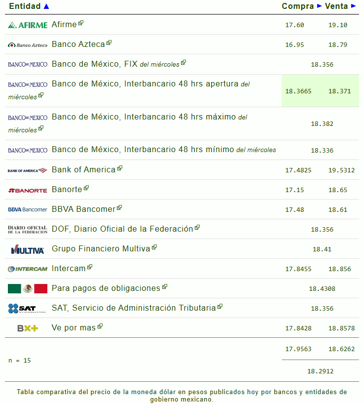 A continuación te brindamos el tipo de cambio dólar a peso hoy en México (USD-MXN), el precio compra y venta en los bancos mexicanos e instituciones de gobierno.