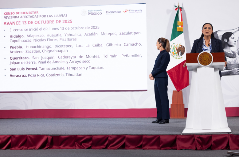 La secretaria del Bienestar, Ariadna Montiel Reyes, informó que se han censado 4 mil 178 viviendas en 30 comunidades de los cinco estados afectados. Además, anunció que en coordinación con la Secretaría de Trabajo y Previsión Social (STPS), se abrieron 5 mil espacios para que se incorporen a las tareas de limpieza beneficiarios del programa Jóvenes Construyendo el Futuro.