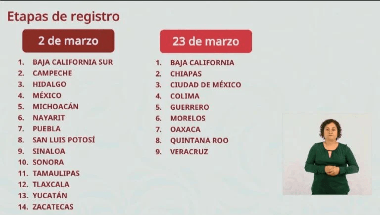 La primera etapa comenzará el 14 de marzo en entidades como Estado de México, Puebla, Sinaloa y Yucatán. A partir del 23 de marzo, el proceso se ampliará a Ciudad de México, Chiapas, Veracruz y Oaxaca.