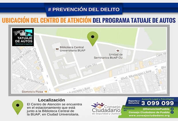 ¡Síguenos!Debido a la demanda que ha tenido el programa “Tatuaje de autos, márcalo por tu seguridad” y al interés que éste ha despertado en la ciudadanía, la Benemérita Universidad Autónoma de Puebla y el Consejo Ciudadano de Seguridad y Justicia de Puebla anuncian que, a partir de esta fecha, el programa quedará abierto a todo público, completamente gratis.