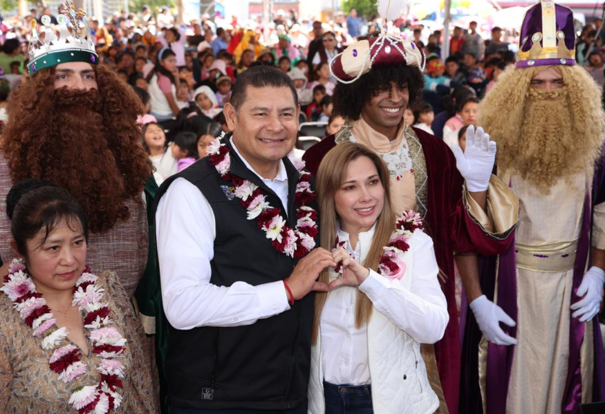 CIUDAD DE PUEBLA, Pue.- Miles de juguetes para niñas y niños de las 27 microrregiones fueron entregados de manera simultánea por el Gobierno del Estado, durante el tradicional festejo de Día de Reyes. El mandatario Alejandro Armenta acompañado por su esposa Ceci Arellano, presidenta del Patronato del Sistema Estatal DIF, presidieron la entrega desde la junta auxiliar de San Miguel Canoa, con población predominantemente indígena de la etnia nahua.