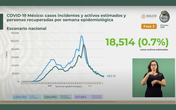 La Secretaría de Salud informó también este lunes (7/06/2021) que el número de casos estimados es de 2 millones 619 mil 14, de los cuales 18 mil 514 están activos.