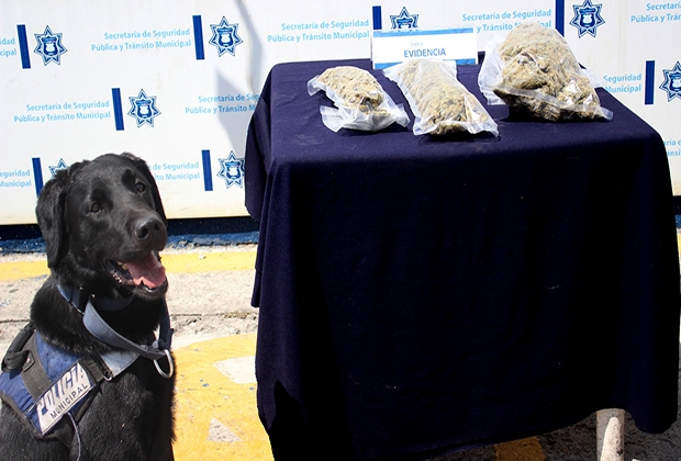 Policías Municipales adscritos a la Unidad Canina, efectuaban una revisión preventiva a una empresa de envíos ubicada en el cruce del Bulevar Hermanos Serdán y la calle Colima Poniente de la colonia San Rafael Oriente, cuando un ejemplar canino especializado en detección de narcóticos modificó su conducta frente a una caja.