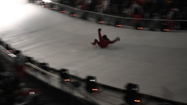 El invitado de último minuto se deslizó a lo largo de una cascada de hielo para encontrarse frente a dos artistas, cuando fue inmovilizado por los servicios de seguridad del estadio.